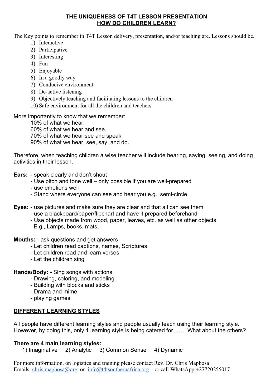 The Today for Tomorrow curriculum is designed to reach children engaging their ears, eyes, mouths and body as well as their mind. The lessons teach children using all learning styles: Imaginative, Analytic, Common Sense and Dynamic.